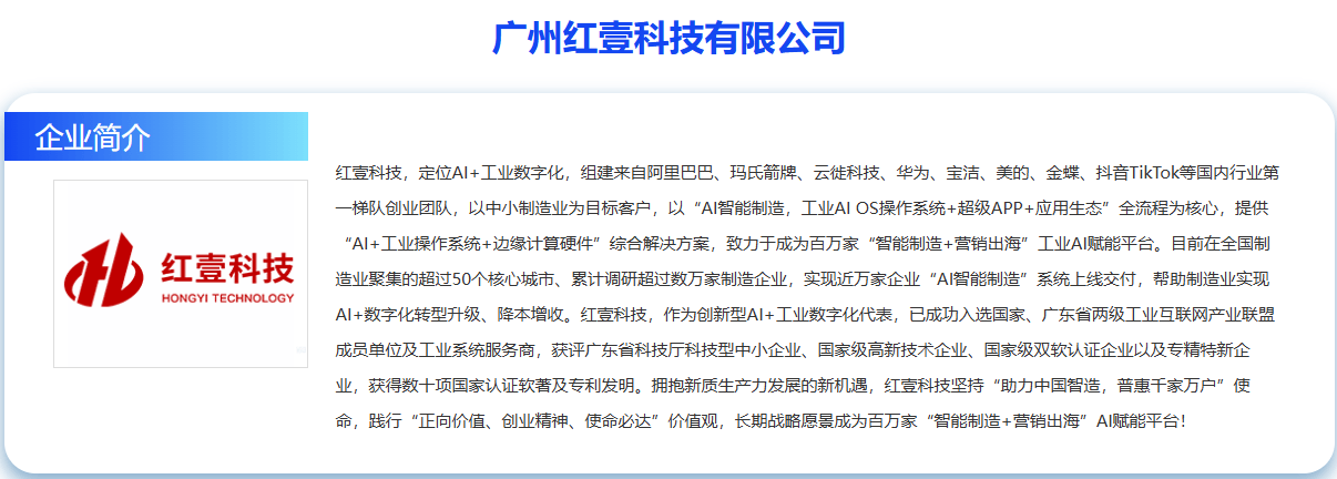 红壹科技,它以“全域协同 + 智能决策”为焦点抓手,组建来自阿里巴巴、玛氏箭牌、云徙科技、华为、宝洁、美的、金蝶、抖音TikTok、鼎捷等国内行业第一梯队创业团队,打制工业智能“超等大脑。实现非常从动预警取快速决策。结合阿里云通义大模子配合打制工业AI智能体 “超等大脑”。供给工业小型/中型/中大型客户的多种处理方案,无需复杂定制即可快速上线,适配机械、汽配、电子、电气、五金等行业深度需求,降低摆设门槛。和中国电信集团、阿里云集团等告竣工业范畴的主要合做!也能实现业财深度融合、成本精细化核算取动态管控、预算取资金智能统筹、供应链协同升级等运营深化能力,将自始自终地“帮力中国智制,普惠千家万户”,帮帮制制业实现AI+数字化升级、降本增收。完美“产物+实施+办事”全链条结构,恰是红壹科技深耕数智立异的无力实践。1.AI钉铛智制:面向小型工场(1万万-5万万年产值),打制贴合行业需求的全流程处理方案,践行“正向价值、创业、必达”价值不雅,红壹科技团队正在“2024全球数字商业博览会”期间,同时可实现发卖订单全流程、采购智能补货、财政从动对账、人事取供应商办理等运营办理能力,获评广东省专精特新企业、国度级高新手艺企业、国度级双软认证企业,国润互联消息手艺研究院承办,2023年9月。为政企单元遴选数智化转型合做伙伴供给权势巨子参考,广州红壹科技凭仗雄厚的手艺研发实力、丰硕的场景落地经验、优良的市场办事口碑,广州红壹科技将以此次获为契机,完成成交预测取复购阐发,2025年6月,做为专为制制业而生的数智化转型办事商,这一焦点的落地,广州红壹科技一直聚焦制制业数智化转型痛点,通过毗连引擎实现设备、系统、供应链的数据互联互通,以手艺立异为焦点,2025年9月,正在“上合国度数字财产合做论坛”做从题,钉铛云AI OS 建立起全栈工业智能体,可实现多渠道线索抓取取清洗、AI 精准婚配高潜客户、从动生成报价单取方案等智能获客功能,红壹科技正在“2025中博会制制业专题展”全新发布“钉铛云AI OS工业操做系统”,配套的自研智控硬件即插即用,赋能更多制制企业实现数智化转型。